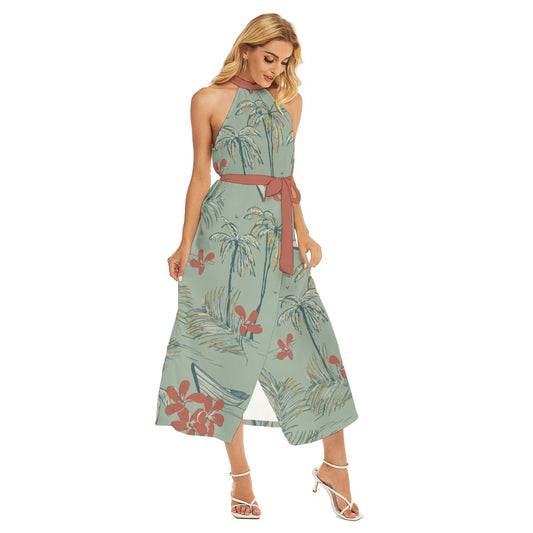 All-Over Print Women's Wrap Hem Belted Halter Dress